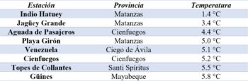 La temperatura más baja registrada en Cuba fue en Indio Hatuey, donde el termómetro descendió a 1.4 grados Celsius, seguido de Jagüey Grande con 3.4 grados.