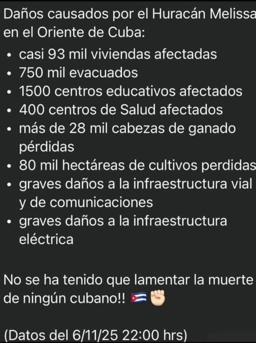 El Gobierno de Cuba divulgó el informe oficial sobre las afectaciones ocasionadas por el huracán Melissa tras su paso por el oriente del país.