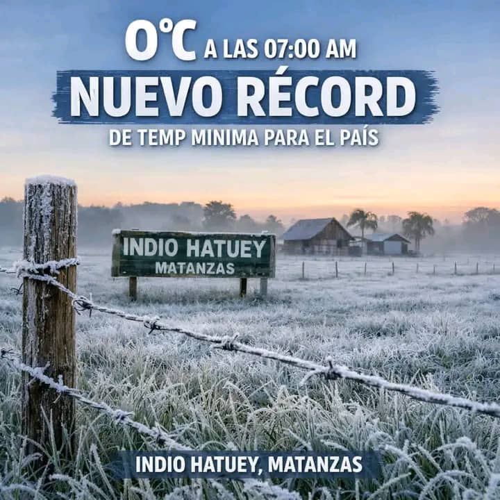 La Habana, Cuba. – La temperatura en Indio Hatuey, Matanzas, continuó descendiendo. A las 07:00 a.m. reporta una temperatura de 0°C, constituyendo nuevo record de temperatura mínima para el país, informó este martes, 3 de febrero de 2026, el Centro de Pronósticos del Instituto de Meteorología de Cuba (INSMET).